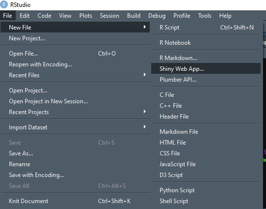 To start building an app, we can either open a new Shiny Web App document as shown in the below figure. This will pop a new window prompting you to select Application name, Application Type (choose single file option), and set the working directory. This will open a file named app.R. This file has a default code for "Old Faithful Geyser Data" app.