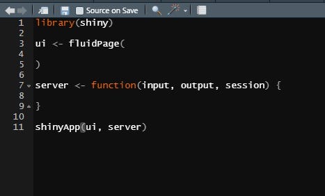 The other option to go about is by opening a new R script (Ctrl+Shift+N for Windows) and saving it by the name of app.R (this is important) in the folder of choice. Then just type shinyapp